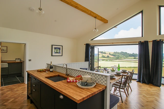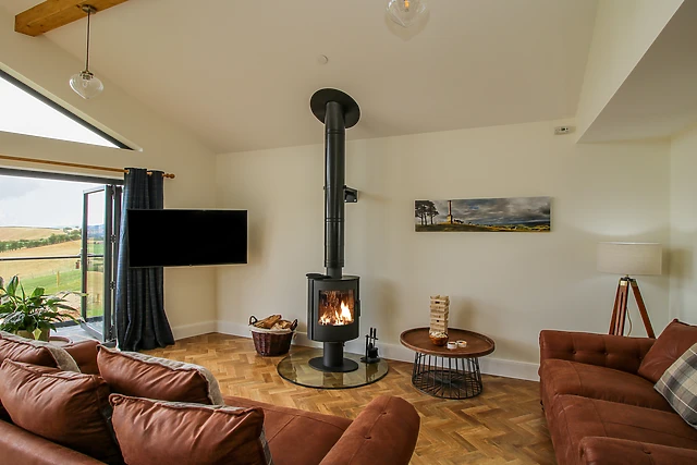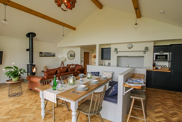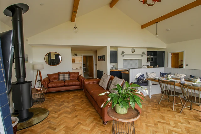 Inside, unwind in the open-plan living space, with its AGA woodburner and parquet flooring, or indulge in the sleek, fully-equipped kitchen.