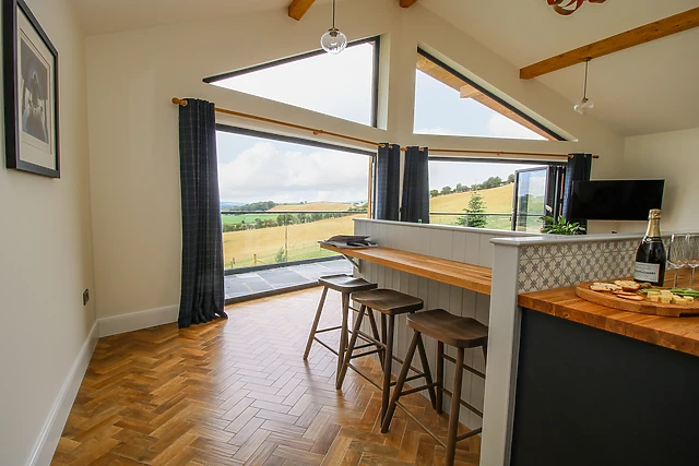 Outside, the private sunken hot tub awaits, offering stunning vistas over the surrounding hills.