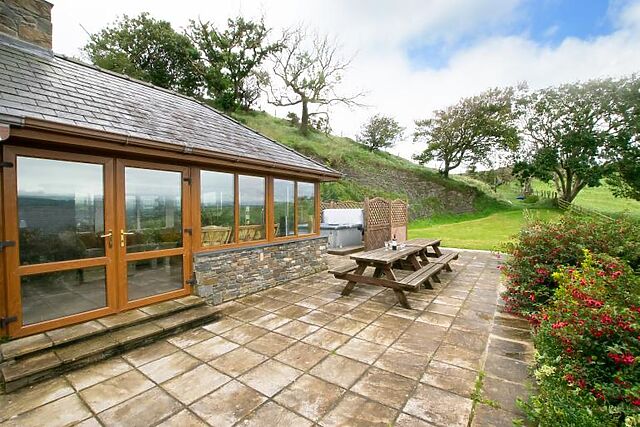 The property boasts a hot tub, ideal for relaxing under the stars.
