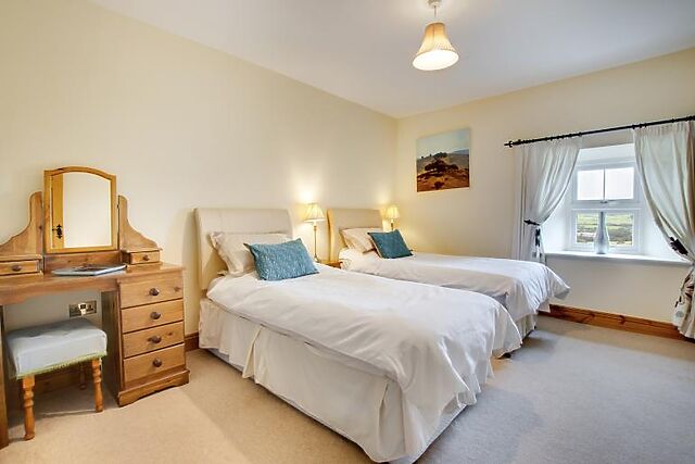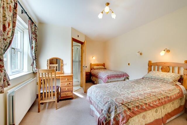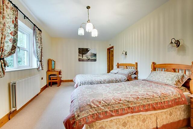 The cosy sunroom offers gorgeous views, while the well-proportioned kitchen provides ample space for socialising. The ground floor also includes a utility room, a WC, and a bedroom with two single beds and an en-suite shower room.