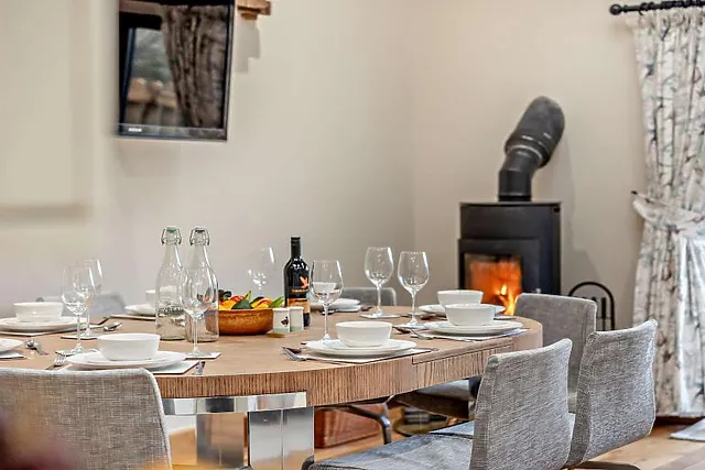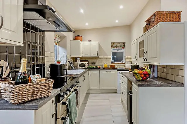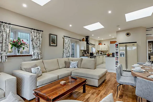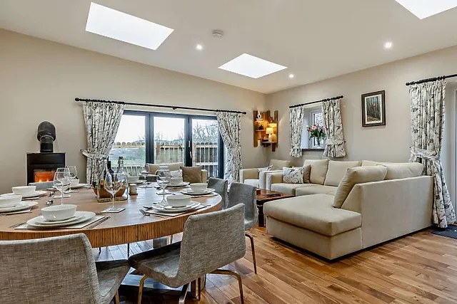 And with incredible views from the patio doors, it’s the perfect space for entertaining with loved ones. A traditional wood burner sits in the corner of the large room, with a corner sofa, big enough for everyone to get comfortable.