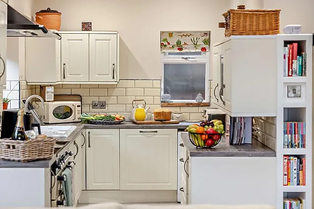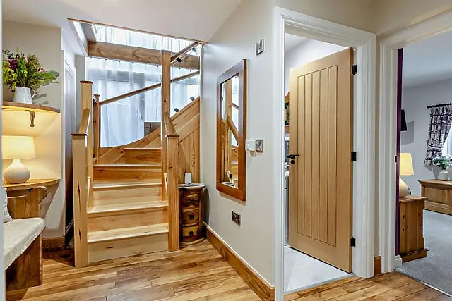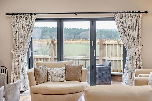 The swivel loveseat is perfectly placed to enjoy a cosy morning coffee admiring the view from inside. The beautifully finished farmhouse kitchen is a wonderful space with high-quality appliances, smart design and everything you will need to rustle up a delicious feast – not forgetting a KRUPS coffee machine and the trusty air fryer.