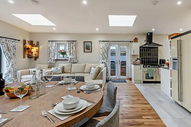 Explore Shropshire Hills AONB by foot or bike, for slower-paced days, and visit the pretty nearby market towns of Shrewsbury and Ludlow, both within 25 miles. Stepping into this character-filled conversion, you’re instantly welcomed by the heart of the property; an open-plan living, kitchen and dining space.