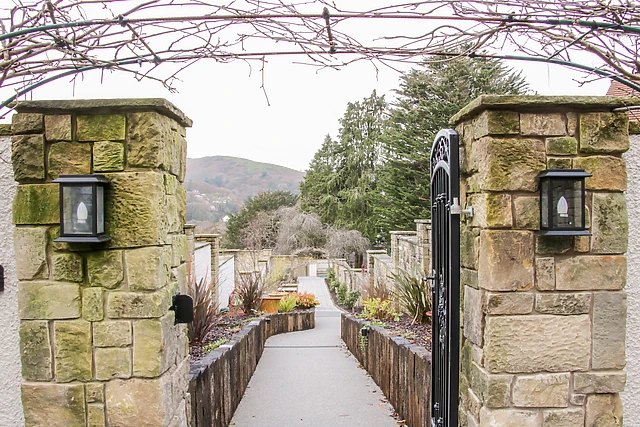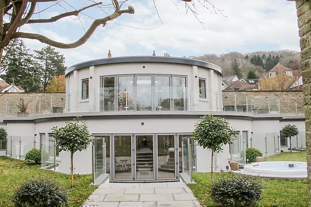Step outside to discover a private garden with a circular hot tub, where you can soak in the serenity of this unique home. The property also features a wrap-around balcony, offering alfresco dining with a view, and a charming garden pathway adorned with wisteria and stone archways.