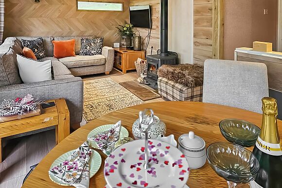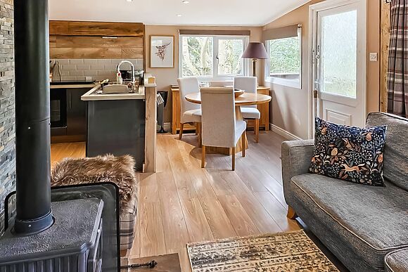 The living area has a wood burner with initial fuel included. Perfect for unwinding after a day outdoors.