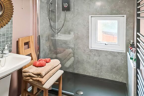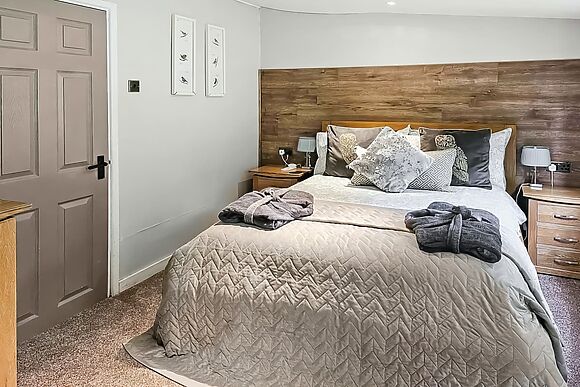 Inside you'll find a double bedroom (4ft 6in) with walk-in wardrobe, a double shower room with heated towel rail and a kitchen with electric oven, hob, dishwasher and coffee machine. A wood burner and Smart TV complete the living space.