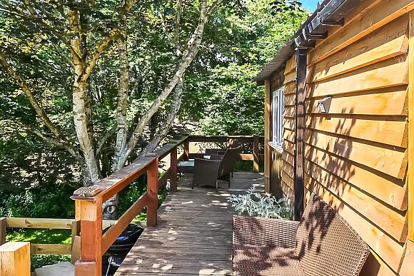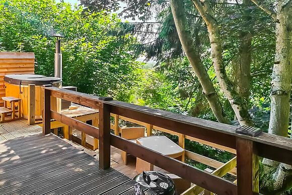 A wood-fired hot tub for two sits on the wraparound deck surrounded by woodland. Total privacy guaranteed.