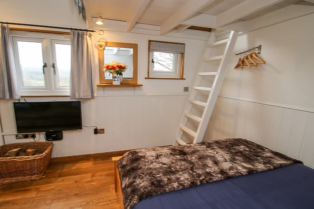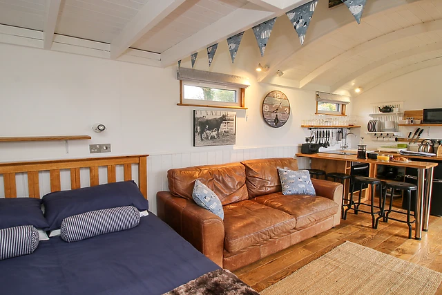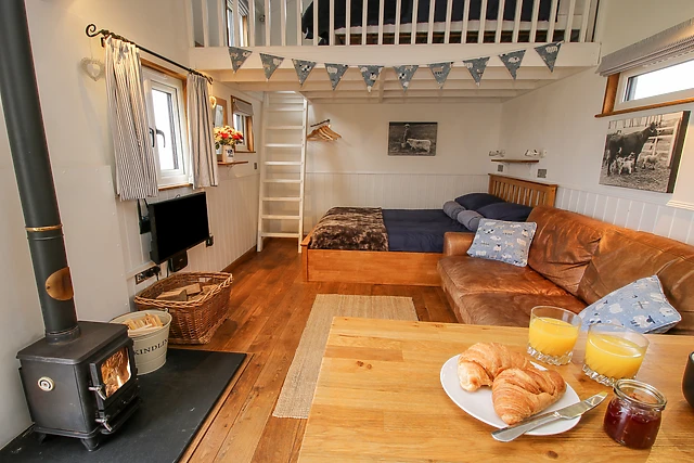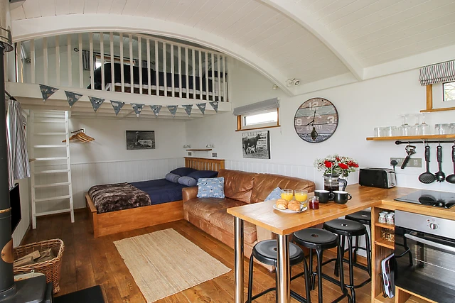 The inside of the property while small offers a real homely feel, with guests entering the property immediately finding the open-plan living area, which has a fully modern kitchen, sitting area with log burner. The king-size bed, is on the mezzannine, which is located via a ladder.