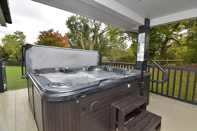 Step outside onto the veranda and find yourself in an oasis of calm, with a private hot tub offering views of the lush landscape. The property also provides access to shared tennis courts and a children's play area, adding to the array of leisure options available during your stay.