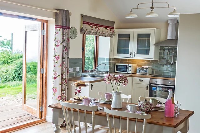 The open plan living area contains eloquent, majestic decor, full of whites, pinks and wooden furniturem this lodge is fabulously combining the traditional with the modern. The well-furnished kitchen looks like that of a stately home with all of the equipment you could need in a secluded log cabin.