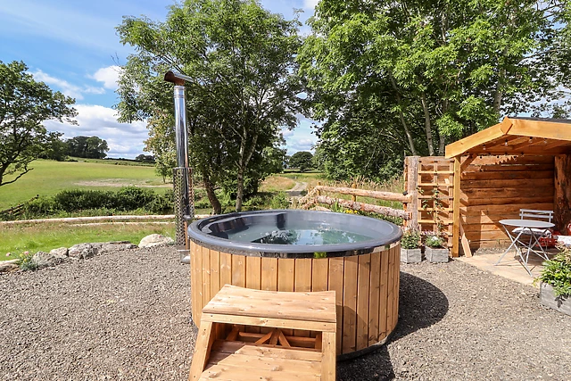 Step outside to discover a private garden with a wood-fired hot tub, where you can soak under the stars. The sheltered barbecue area and outdoor seating are ideal for al fresco dining amidst panoramic country views.