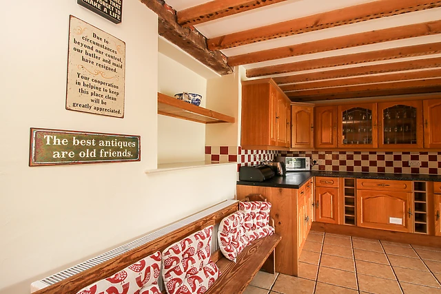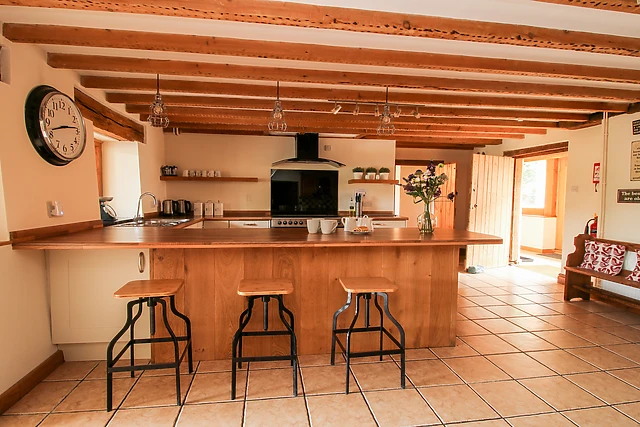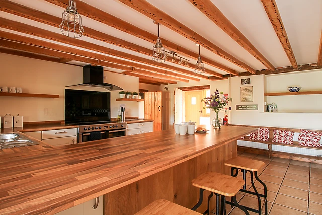 The inviting exterior with stone walls and oak window and door frames welcome you into the well-equipped, spacious kitchen, finished with stylish, modern equipment and decor. Despite being a large cottage, The Old Farmhouse has a certain homely feel to it, with a stately dining table and woodburner sat under traditional wooden beams setting it off wonderfully.
