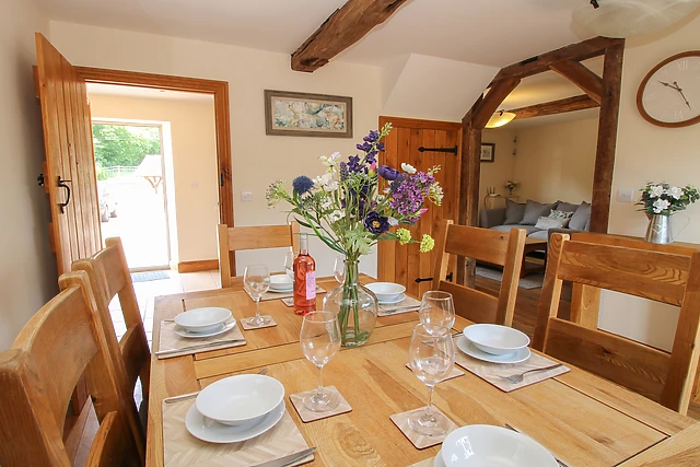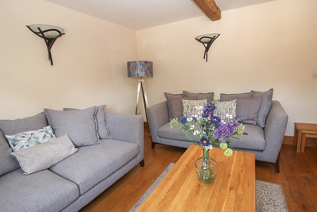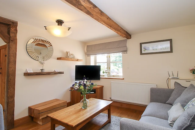 A lovely Westhope cottage, perfect for a romantic or a family holiday. Step inside The Olde Cowshed and discover the welcoming sitting room, complete with exposed wooden beams, comfortable sofas, and a TV for movie nights.
