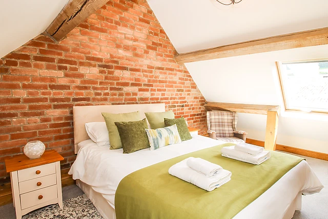 As you make your way to the bedrooms, you'll find the double bedroom with a striking brick feature wall and exposed beams, providing a unique and stylish ambience. The twin room is neatly appointed with pictures on the wall, creating a welcoming and inviting space for guests to relax and unwind.