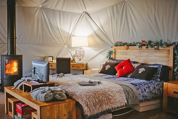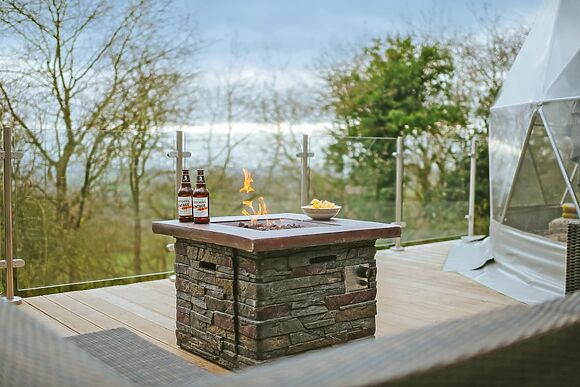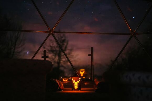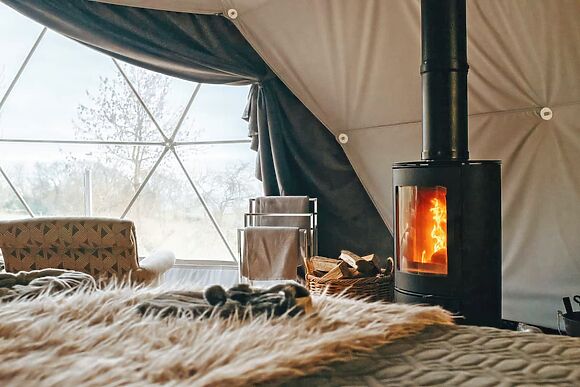 The dome has gas central heating and a woodburner with initial fuel included. Both options mean the space stays warm and comfortable regardless of the weather outside.
