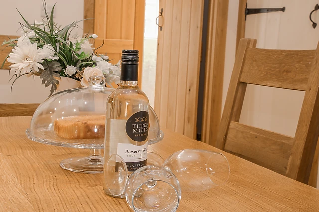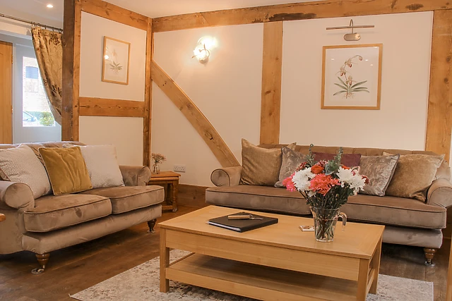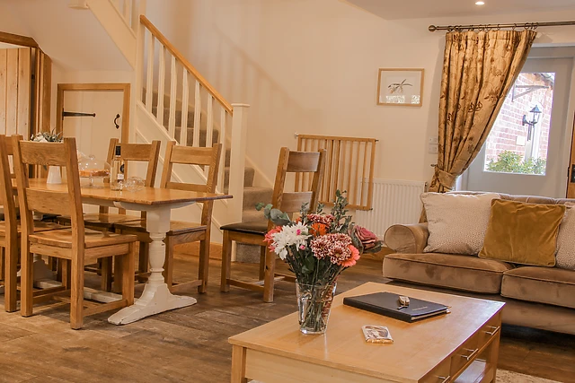 Step inside The Turnip House and be greeted by its open plan layout, with a sitting area featuring wooden trim against white walls, comfortable sofas, and a mounted TV for your entertainment. The doors lead out to the garden, where you can enjoy the fresh countryside air.