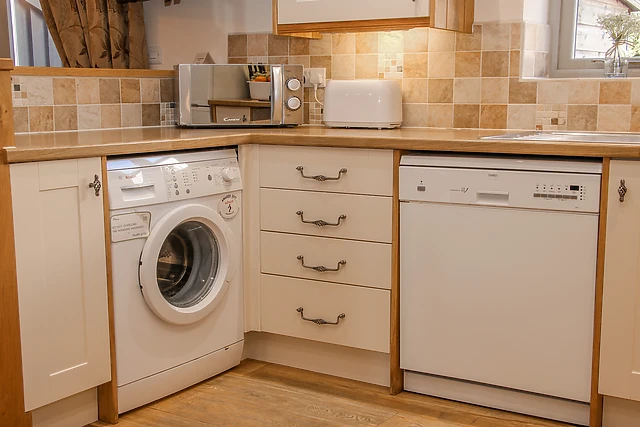 In the dining area, the table is elegantly set for six guests, perfect for enjoying meals together and creating lasting memories. The kitchen area is well-equipped with all the amenities you need, including a washing machine, dishwasher, oven, and hobs for preparing delicious meals during your stay.
