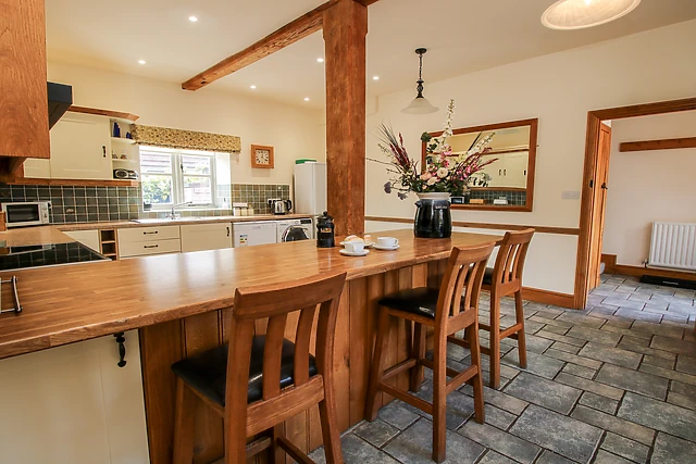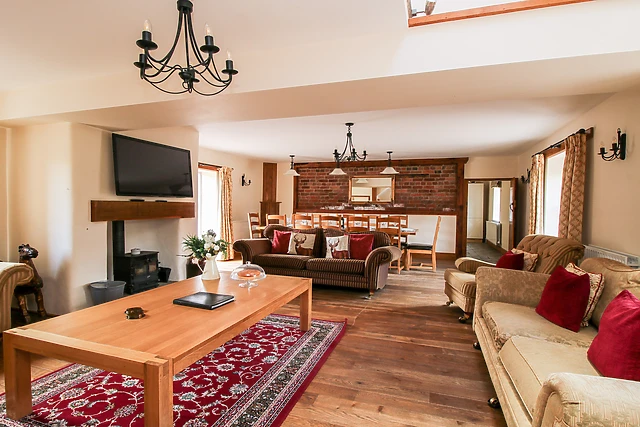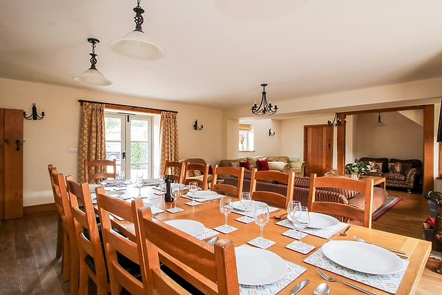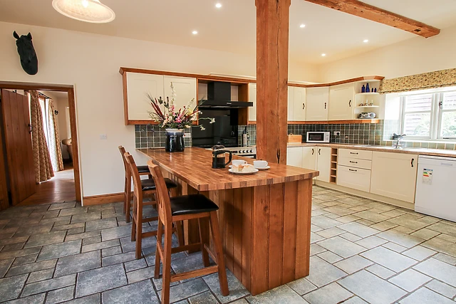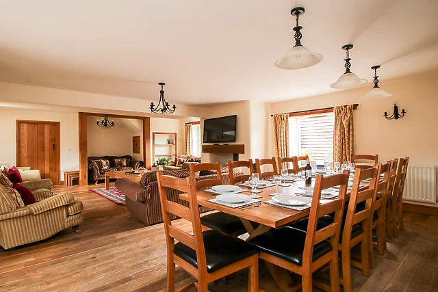 The dining area features a charming brick feature wall and a table set for eleven guests, perfect for family meals or gatherings with friends. Continue into the large, well-equipped kitchen with wooden beams and a central island with breakfast bar seating, providing the perfect space for preparing delicious meals or enjoying a leisurely breakfast.