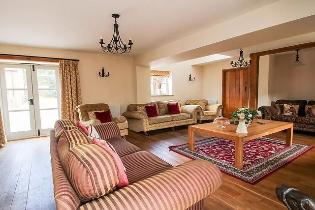 This abode offers five elegantly decorated bedrooms for guests to choose from, including three super king-size rooms, each with its own TV and two with en-suite facilities, a twin room also with a TV, and a spacious family room with a TV for added convenience. Outside, guests can relax and unwind in the private hot tub in the garden, surrounded by comfortable furniture for enjoying the peaceful surroundings of the countryside.