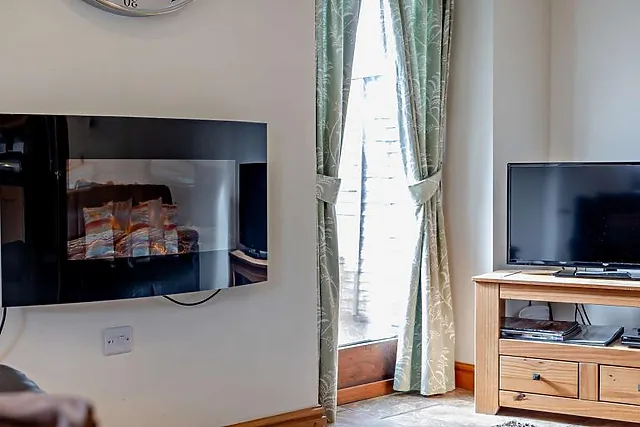 Downstairs is a twin bedroom with a TV and en-suite wet room. Upstairs, you’ll find two more bedrooms: one double with a TV and en-suite bathroom and a small single suitable for a child.