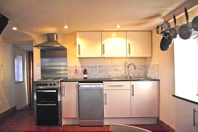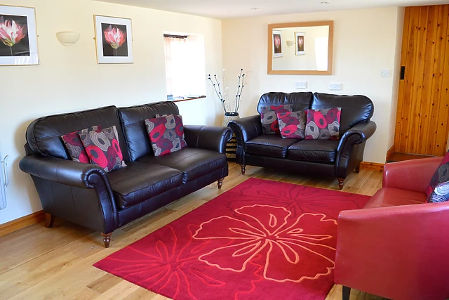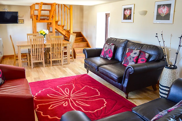 The inviting sitting room, complete with a solid oak dining table and leather sofas, is the perfect spot to unwind. The separate, well-equipped kitchen allows for easy meal preparation.