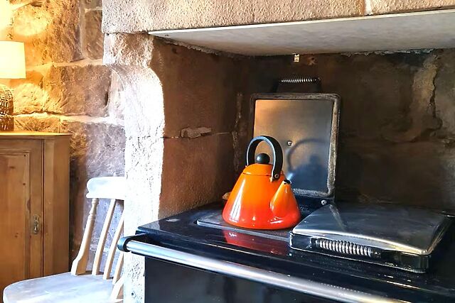You’ll enter into a welcoming hallway, then turn left into the open-plan farmhouse kitchen and dining area. This space is warm and sociable, with oak beams, exposed stonework, wooden floors and underfloor heating, plus a traditional Rayburn range cooker set into the original fireplace.