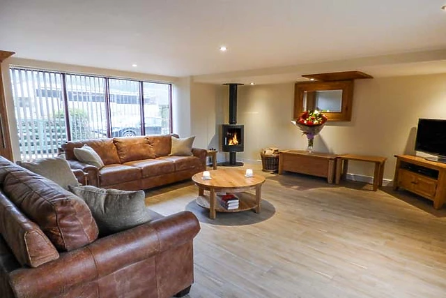 The whole room floods with light from the full height window wall. There are sumptuous sofas where you can flop in front of the designer woodburning stove or maybe watch a movie.