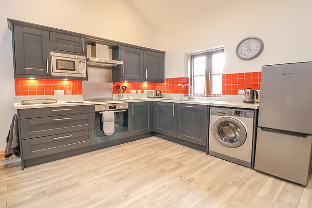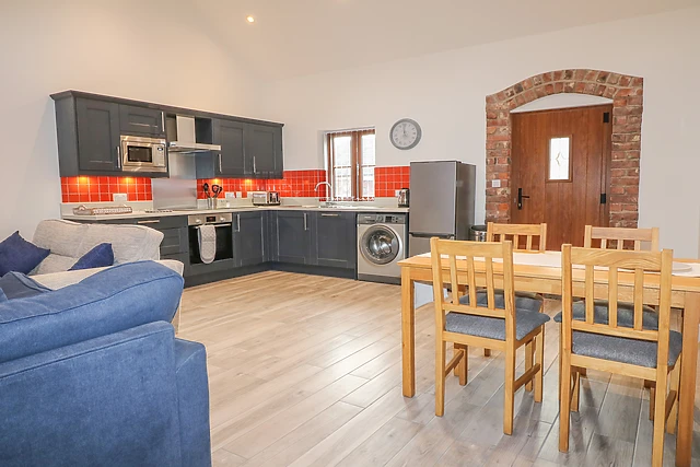 The open-plan living space, complete with a well-equipped kitchen and cosy sitting area, is ideal for relaxing evenings in.