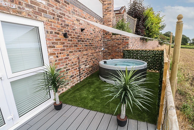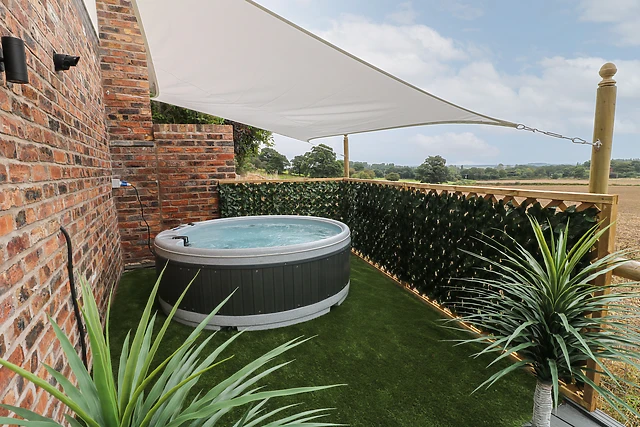 Yes, the accommodation boasts a luxurious hot tub on the front terrace, offering guests a private space to relax and enjoy the countryside views.