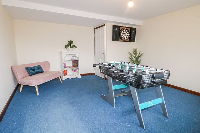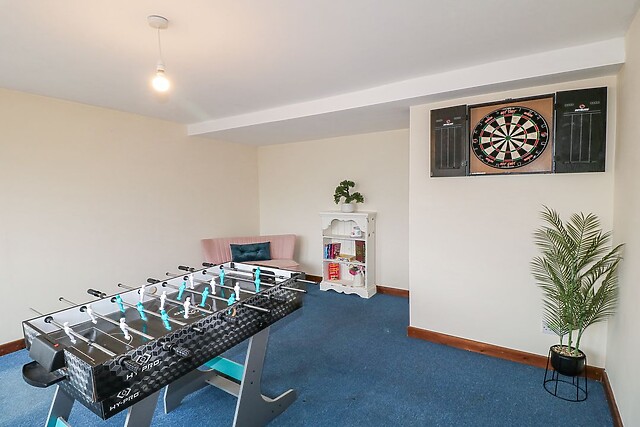The heart of the home is undoubtedly the sitting room, complete with a warming woodburning stove and TV, offers a snug spot to unwind and relax after a day of exploration. Step into the rear garden, where you’ll find a swing and an outdoor games room with a dartboard, table football, and a relaxing reading corner.