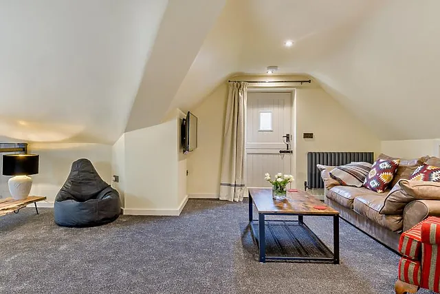 A few steps lead to a relaxed lounge area with a rustic coffee table and a comfortable leather sofa. On the ground floor is a super-king-size bedroom with an en-suite shower room.