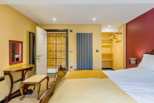 This sophisticated space is decorated in red, black and neutral tones with a fitted ‘L’-shaped kitchen unit with an island. Adjacent is a formal dining table beside the glass patio doors and a wood burner.