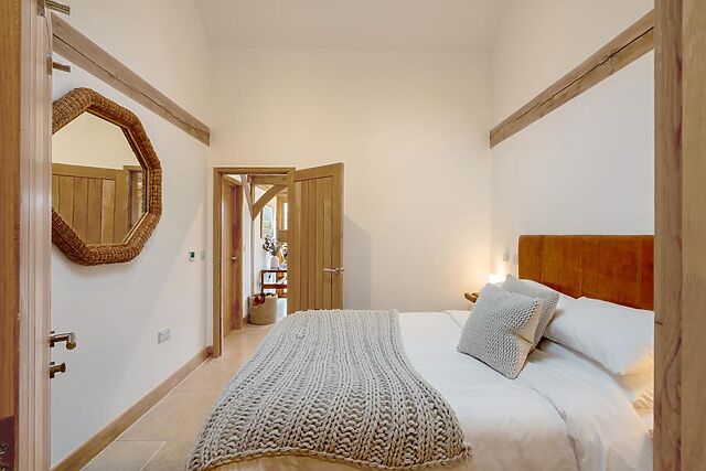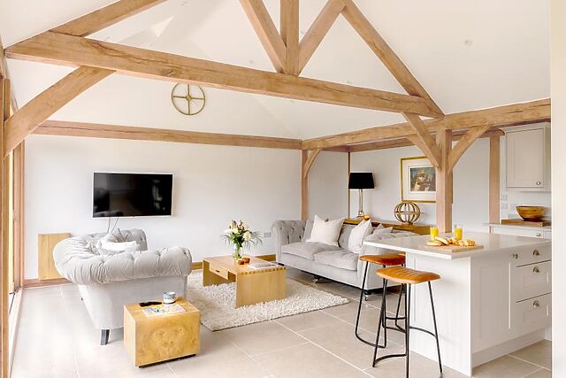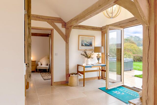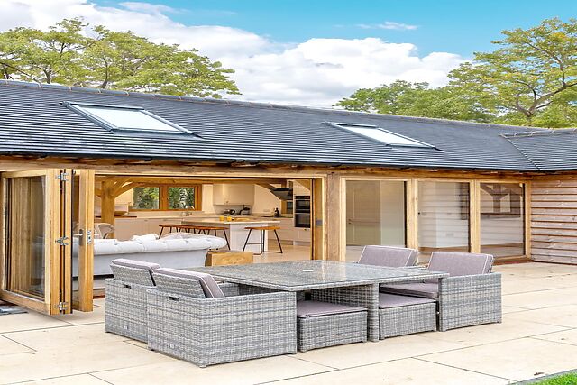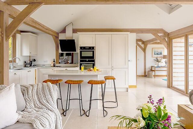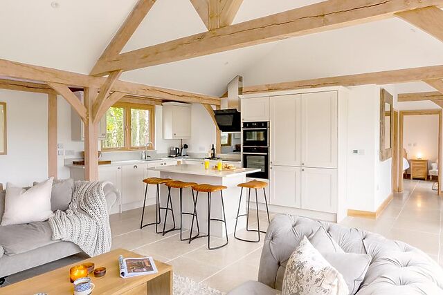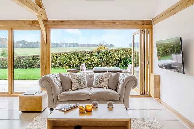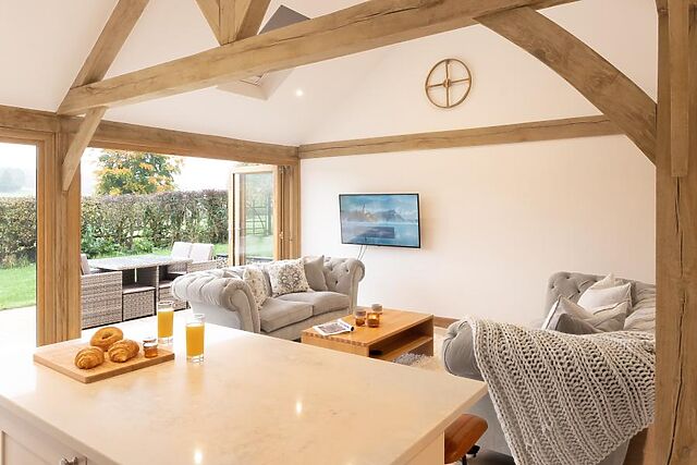 Finished to an exceptional standard throughout, the open-plan living area blends contemporary comfort with refined details, creating an atmosphere that feels both luxurious and welcoming. Exposed beams and wide bi-fold doors invite natural light to flood the space and frame the breathtaking views of rolling fields beyond, making the countryside an ever-present backdrop.