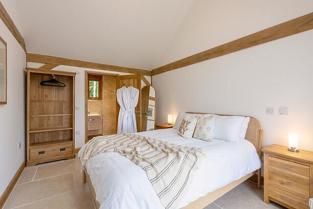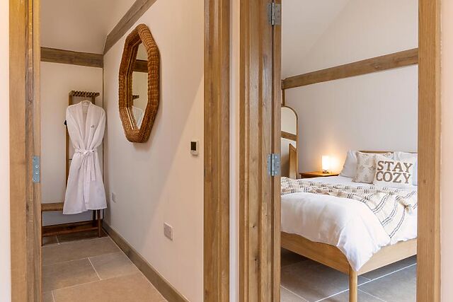 Two beautifully styled bedrooms offer peaceful sanctuaries, each featuring a sumptuous king-size bed, its own Smart TV and a private en-suite shower room. Outside, the lodge opens onto a private garden where uninterrupted field views set the tone for relaxation.