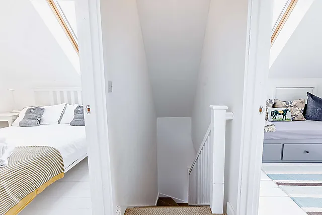 Stonehouse Loft boasts a well-equipped kitchen for culinary adventures, alongside a double bedroom and an additional full-size single day bed, doubling as a dressing room.