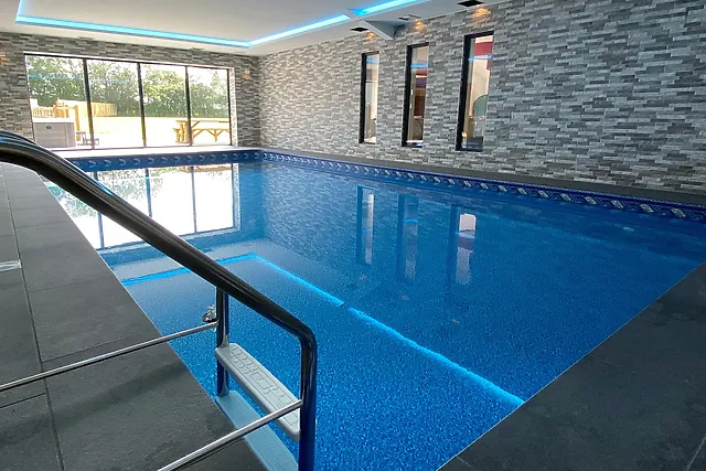 Indulge in the heated indoor swimming pool or unwind in the outdoor hot tub. The property also boasts a quirky shepherd’s hut turned into a bar and games area, adding a unique touch to your stay.