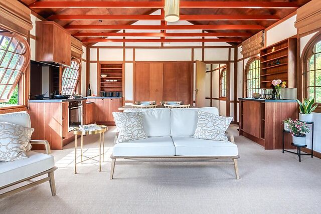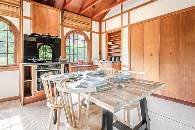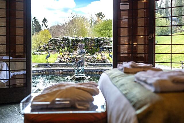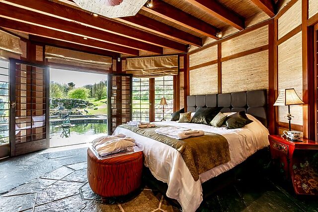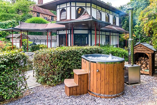 Admire the quirky vaulted ceiling which stunning views across the estate, whilst you unwind in comfort after a day spent exploring. Heading outside, the tranquil water garden complete with Koi carp and Japanese Acer trees makes a beautiful backdrop for your morning coffee or perhaps a sundowner after a dip in the private wood-fired hot tub.