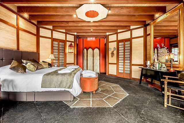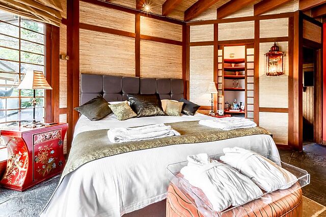 The bedroom is accessed via a veranda and doors to the front on the ground floor. Decorated in an eastern style throughout, this beautiful room is the perfect setting for rest and relaxation and boasts a super-king size bed that can be split into singles on request, an en-suite shower room, WC and sauna are also on this floor.