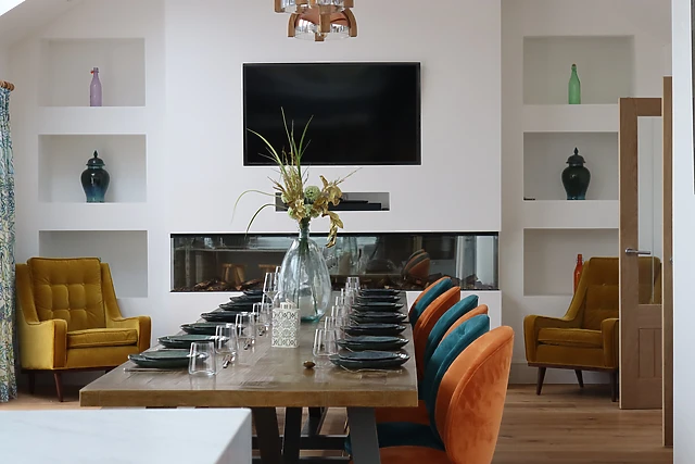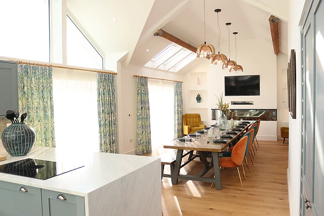 Enter into the spacious and welcoming hallway where you'll feel right at home; continue into the kitchen/diner to find a superbly-appointed room complete with a contemporary fireplace and large dining table to seat all of your guests. Here, you’ll find the kitchen is so inviting, you'll delight in cooking up a tasty meal for your group.