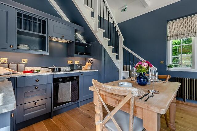 Step inside to find a beautifully designed living area with French doors that open to the garden. The wood burner adds a touch of warmth, perfect for those cosy evenings. The contemporary kitchen is well-equipped, and the dining area is perfect for intimate meals.