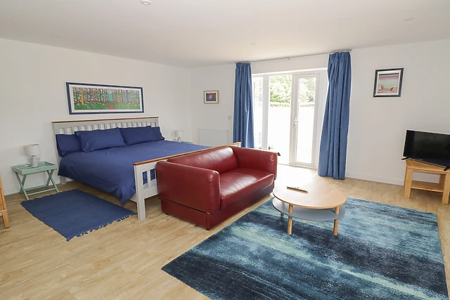 The ground-floor bedroom features a sumptuous super-king-size bed, providing an accessible option for guests with limited mobility.