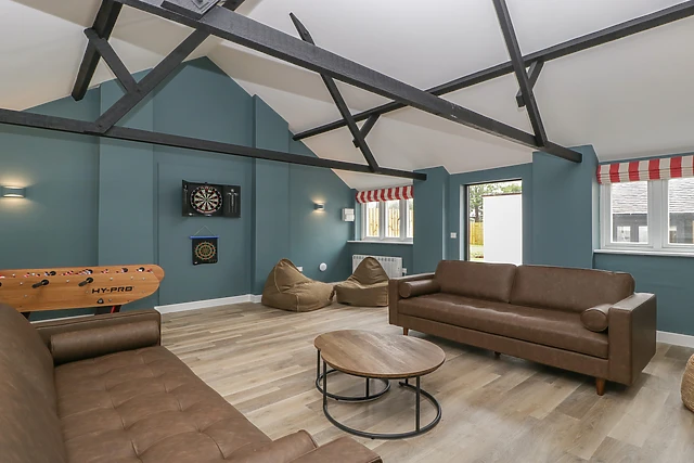 The separate games room with sofas, beanbags, Smart TV, dartboard and indoor football table, provides the luxury of an additional escape, popular with families. On entering this delightful cottage, you will find a spacious hall and an impressive beamed sitting room featuring a wood-burning stove, plush furnishings and ample seating, ideal for the perfect night in.