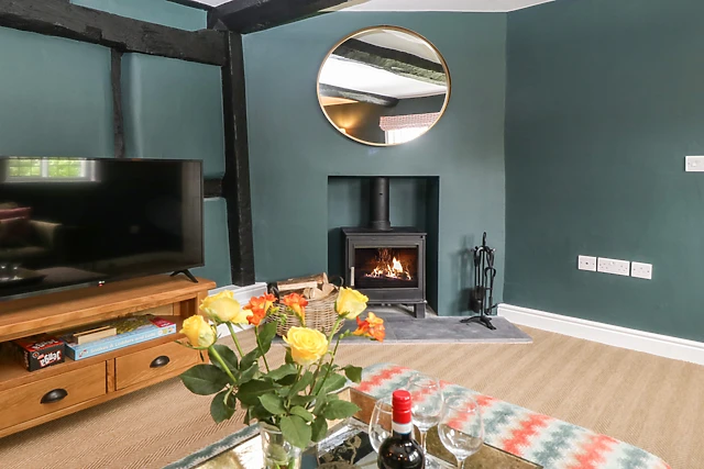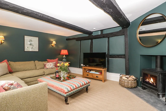 The cottage's heart, a cosy sitting room with a wood-burning stove and plush corner sofa, invites you to unwind.