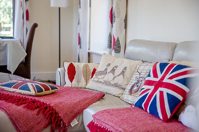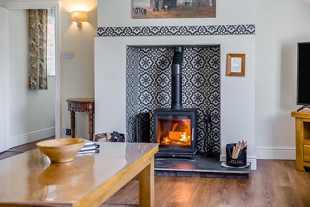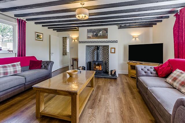 For guests with limited mobility, there is an access ramp to the side of the property which takes you to the back door for easier access. On the ground floor, from the hallway, you step into the lounge, a relaxing space with comfortable seating, a wood burner and Smart TV.