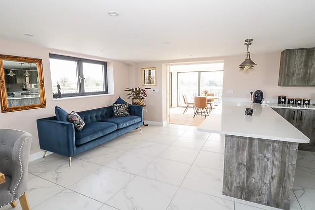 The open-plan living space is a highlight, with a fully-fitted kitchen, dining area, and a cosy sitting room complete with a Smart TV.