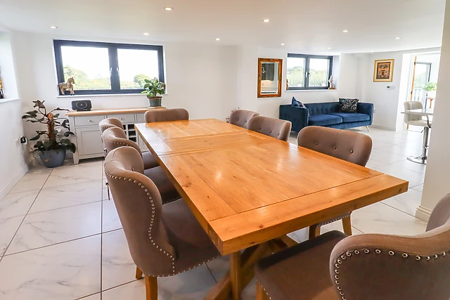 The property features five tastefully appointed bedrooms, including a ground-floor super-king-size with an en-suite, ensuring comfort for all guests. The open-plan living space is a highlight, with a fully-fitted kitchen, dining area, and a cosy sitting room complete with a Smart TV.