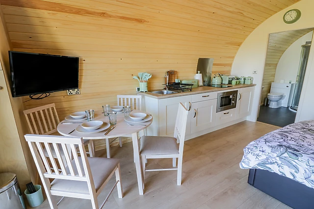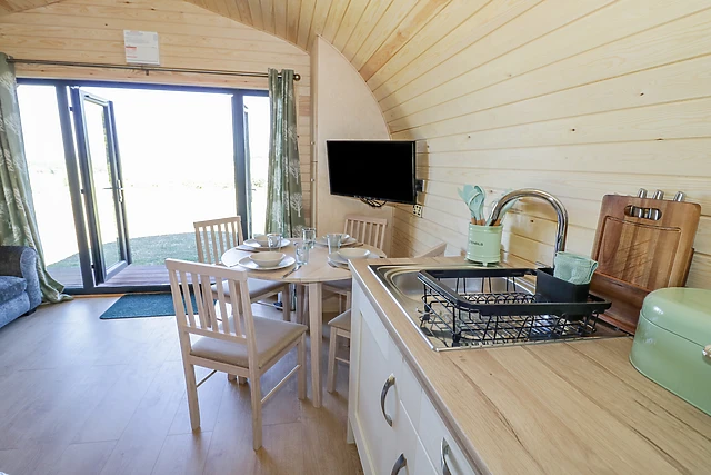 The open-plan living space boasts a well-equipped kitchen, dining area, and a sitting area with a Smart TV, perfect for cosy evenings in.