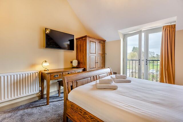 When eyelids start feeling heavier, head upstairs, leaving the pooch to snooze, and find the super-king-size bedroom with an en-suite shower room, high ceilings and a Juliette balcony, finished with William Morris wall coverings and beautiful furnishings. Outside, couples can relax within a private courtyard with a raised terrace with seating – a lovely spot for a quiet morning coffee.