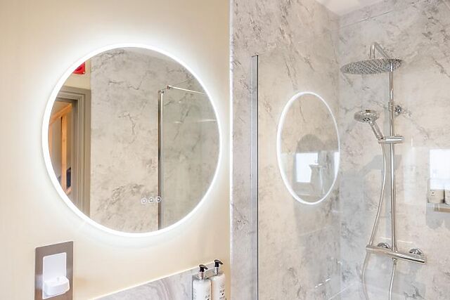 The master bedroom features a super-king-size bed and a Juliette balcony, while the twin room offers comfort and a Smart TV. A well-appointed walk-in shower room completes the interior, ensuring a comfortable stay.