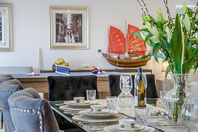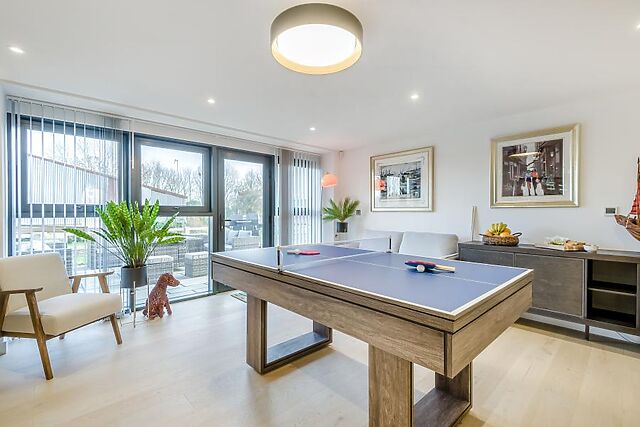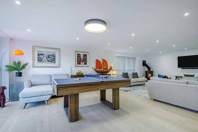 The large dining table is surrounded by comfortable chairs, perfect for celebrating special occasions together over a delicious meal. There’s a games area with all-in-one table tennis and pool and, when you’re ready to sit back and relax, the lounge area features plenty of soft seating, a wood burner and a Smart TV.